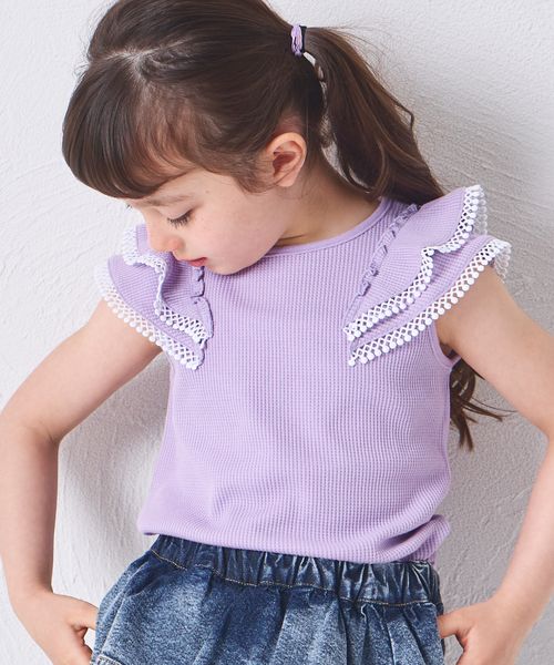 【さらっとワッフル】ガールズ 肩フリル 無地 トップス