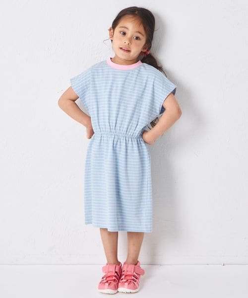 【綿100%】ガールズ ネームタグ付き カラーボーダーワンピース
