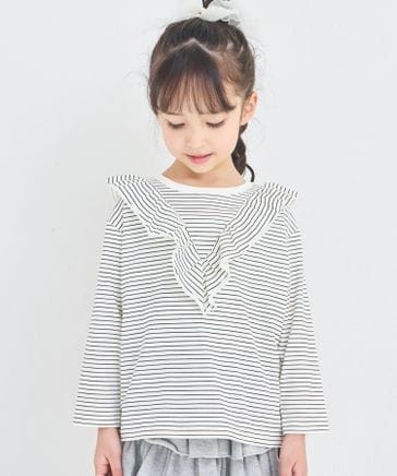 【綿100%】ガールズ 袖フリル カラーボーダーロンT