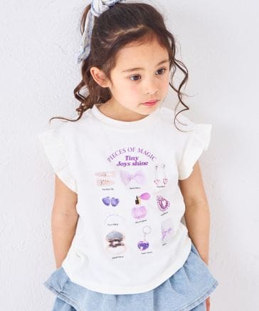 【綿100%】ガールズ 袖フリル アクセフォトプリント 半袖Tシャツ