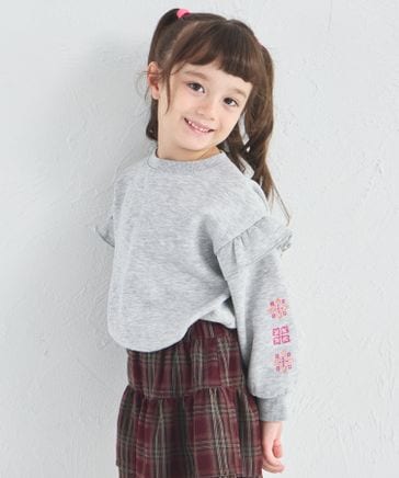 【ぬくふわ】裏起毛 肩フリル ステッチ風 袖刺繍 トレーナー