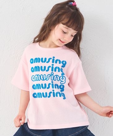 【リンクコーデ】【さらっとワッフル】ガールズ 袖フリル 総柄 半袖Tシャツ