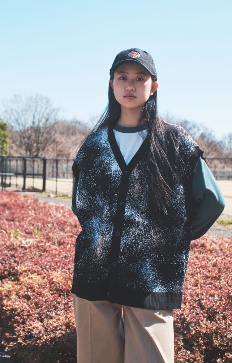 シンプルなニットベストはアレンジ自在。レイヤードスタイルはもちろん、小物使いでも簡単に変化をつけられる。なかでもおすすめなのは、ストリートMIX。キャップやスニーカーと合わせて、今っぽくラフに仕上げみて。