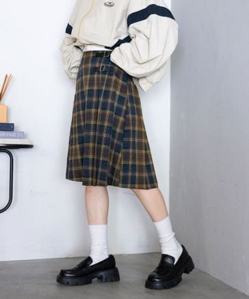 【WOMENS】選べる着丈/Wベルトキルトチェックプリーツスカート