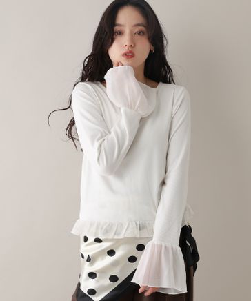 【WOMENS】袖チュールレイヤードリブロンT