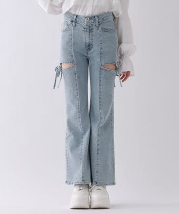 【美脚デニム】スリットリボンフレアデニムパンツ