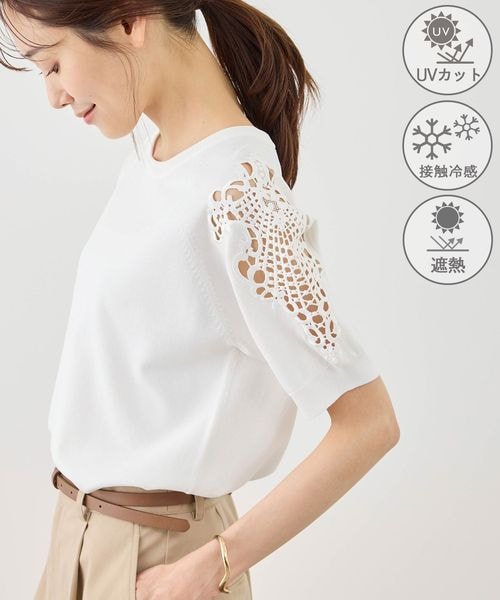 八方映えニット 袖レースニットプルオーバー/UVカット・接触冷感・イージーケア