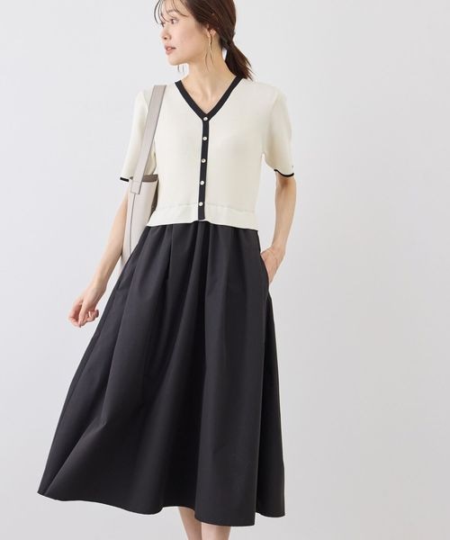 メタル釦布帛ドッキングハーフスリーブニットワンピース