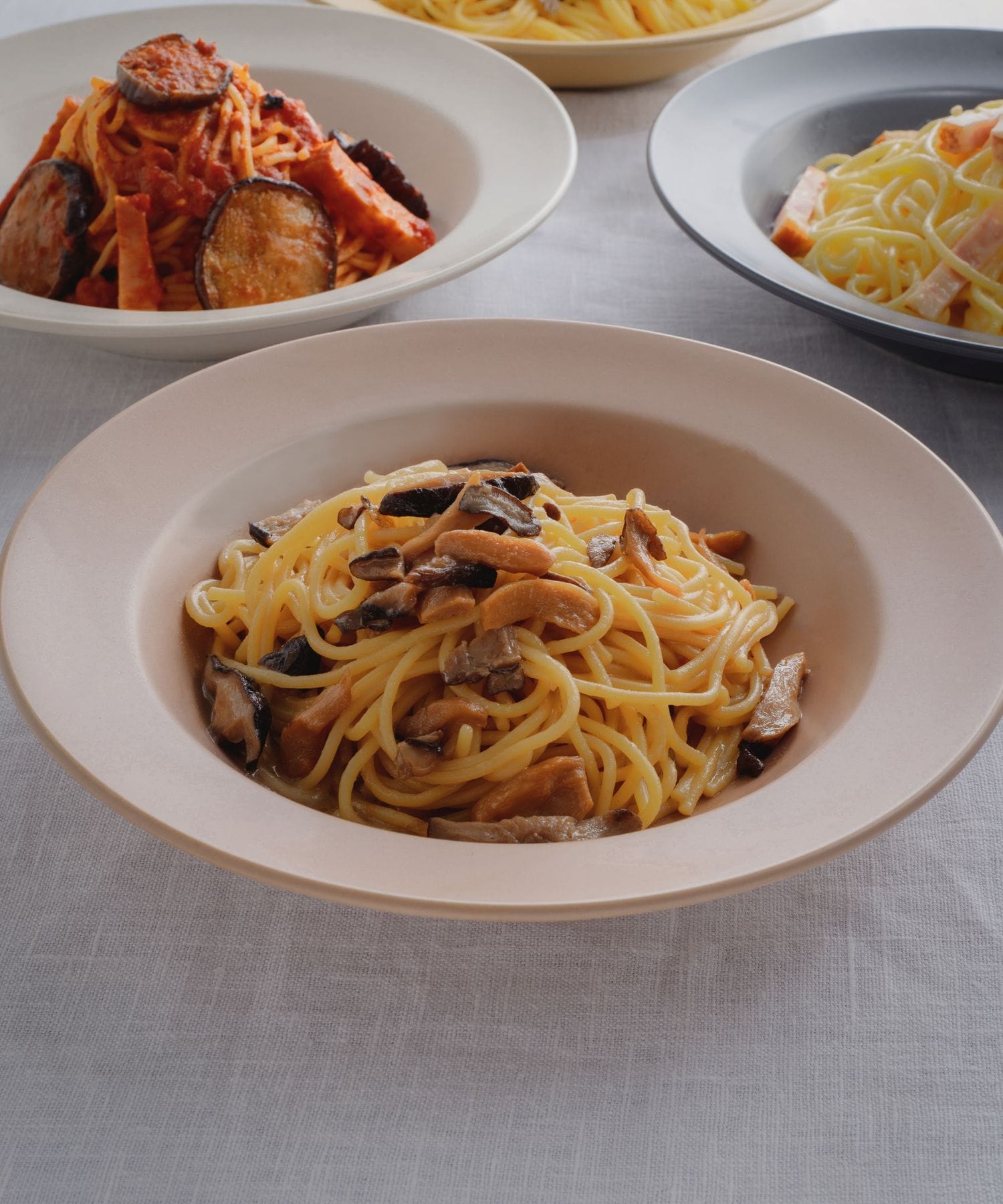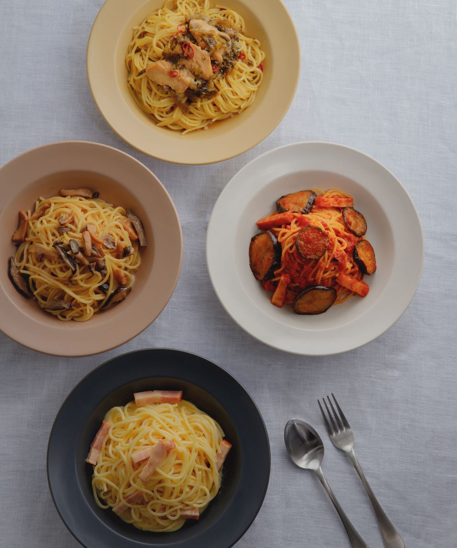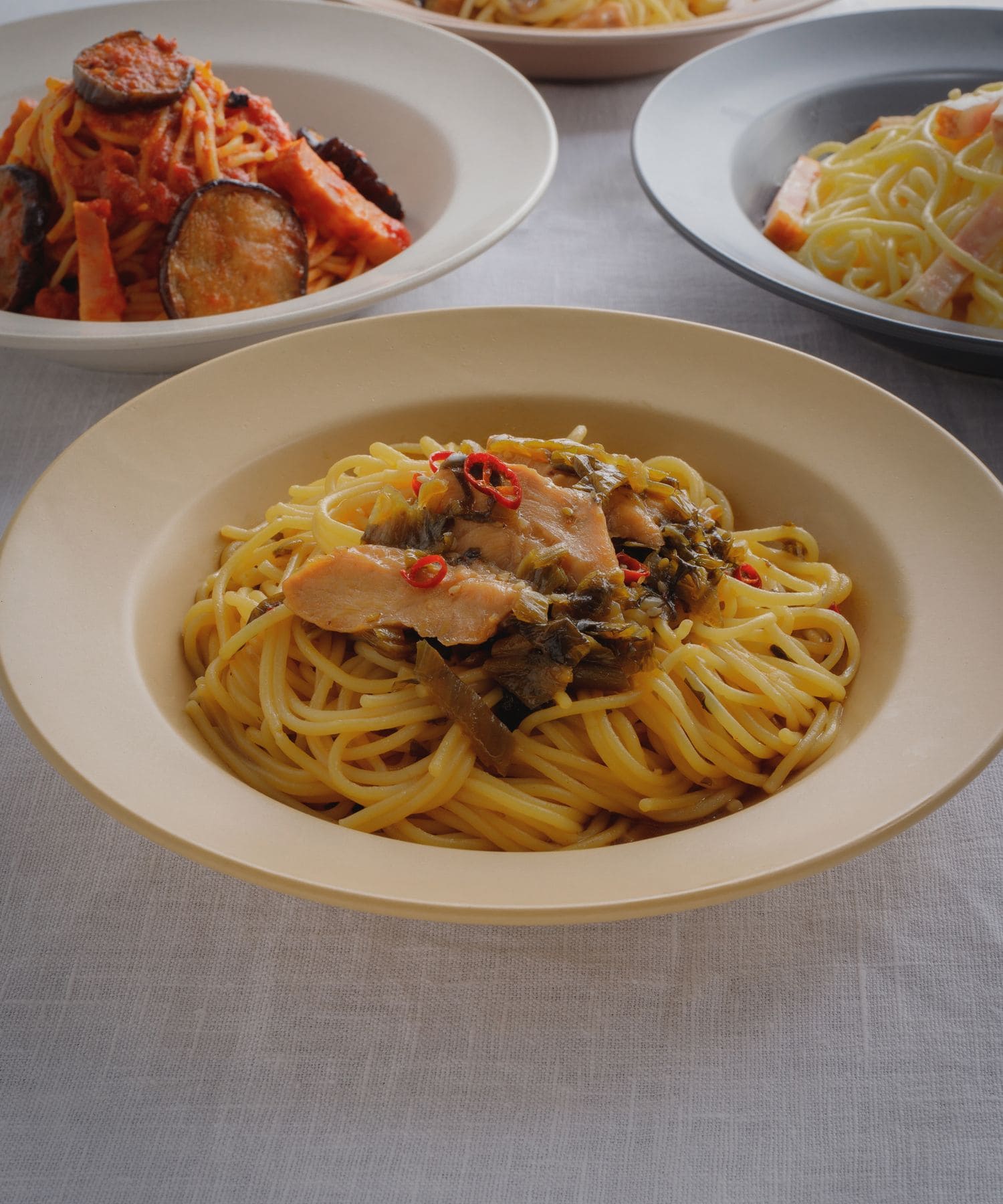 きのことバター醤油和風ソース、高菜と鶏肉のピリ辛オイルソース、