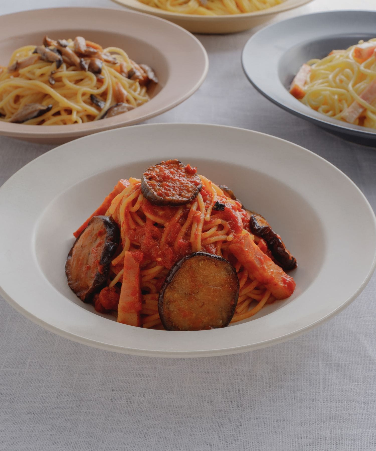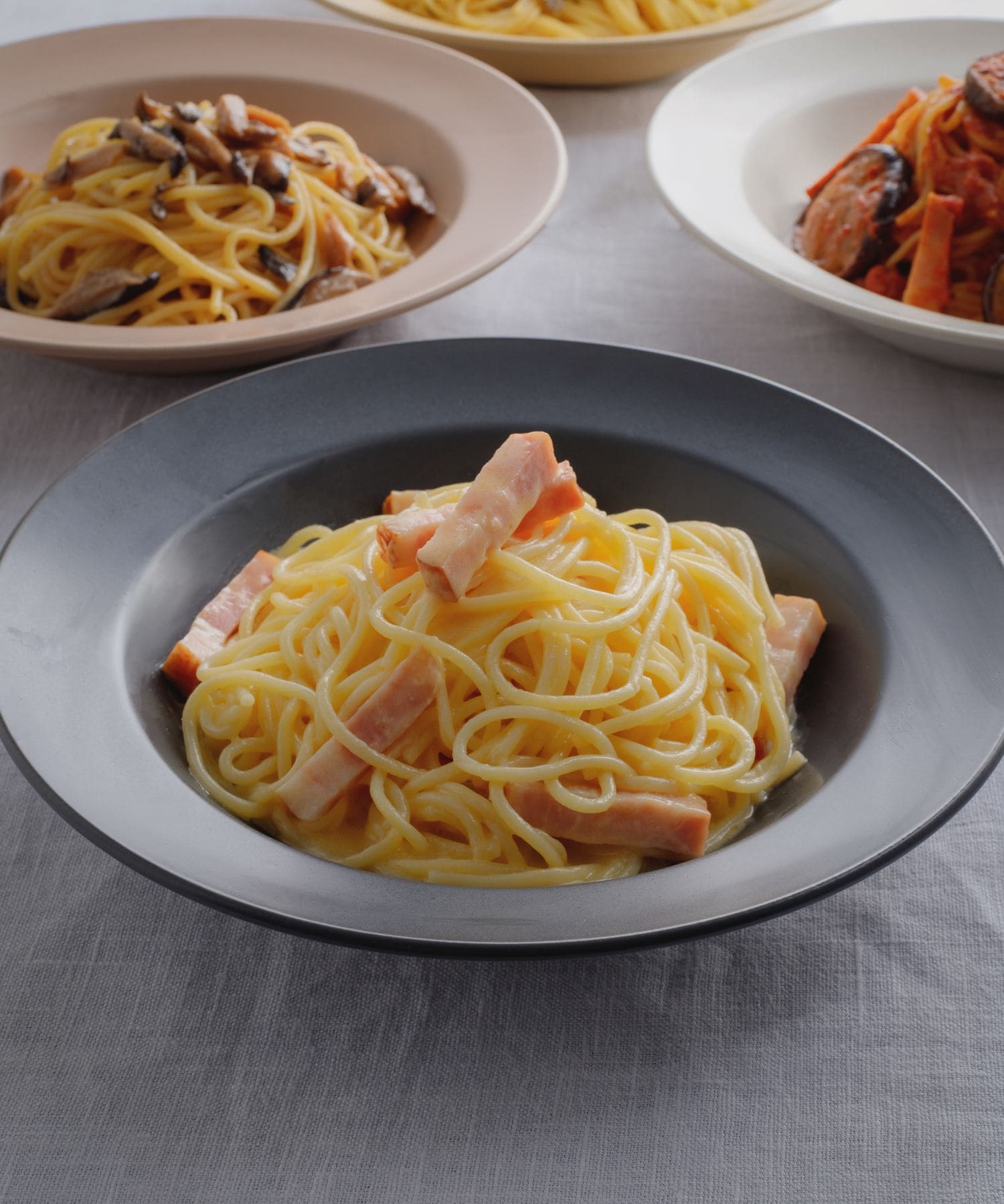 人気の厚切りベーコンのカルボナーラ、厚切りベーコンとトロトロなすのトマトソース、