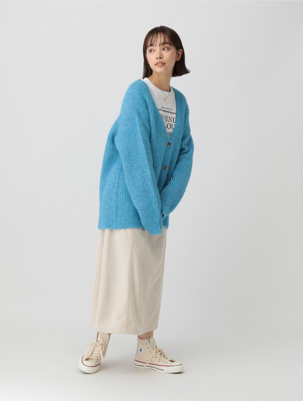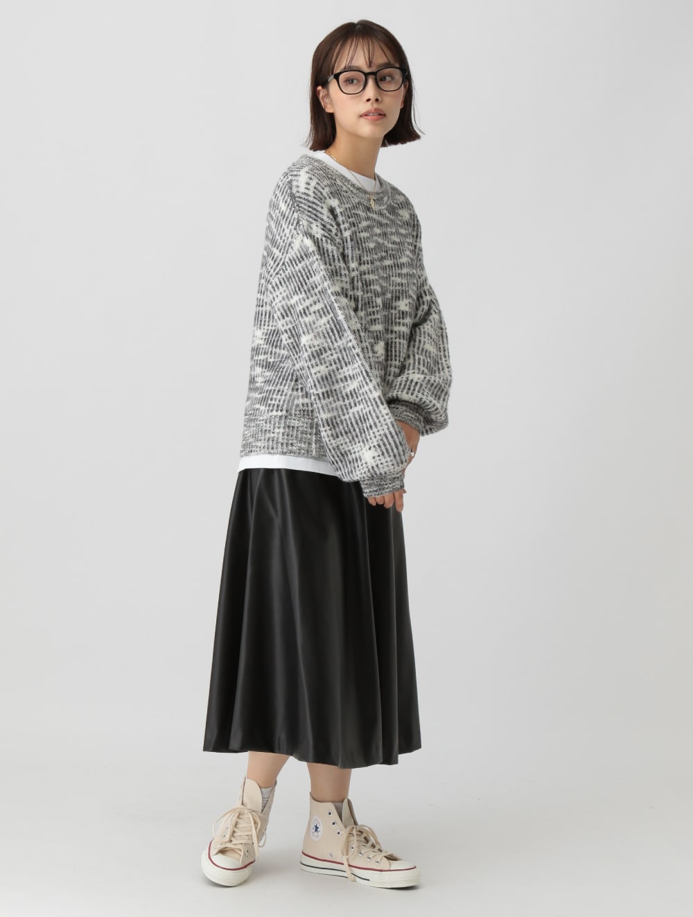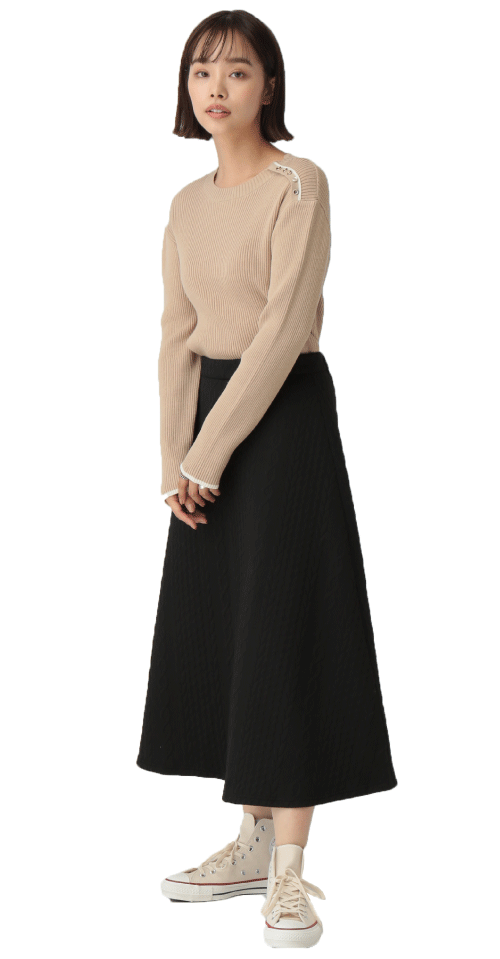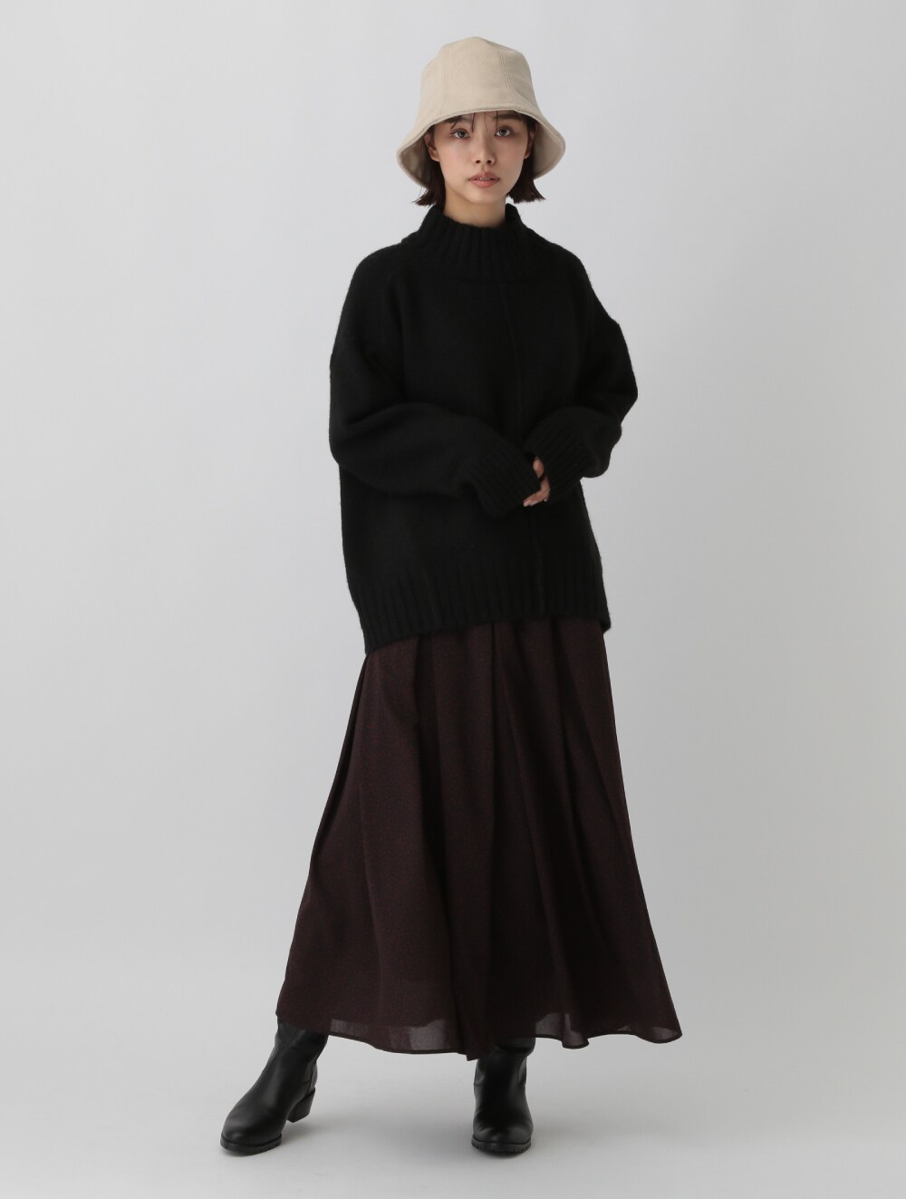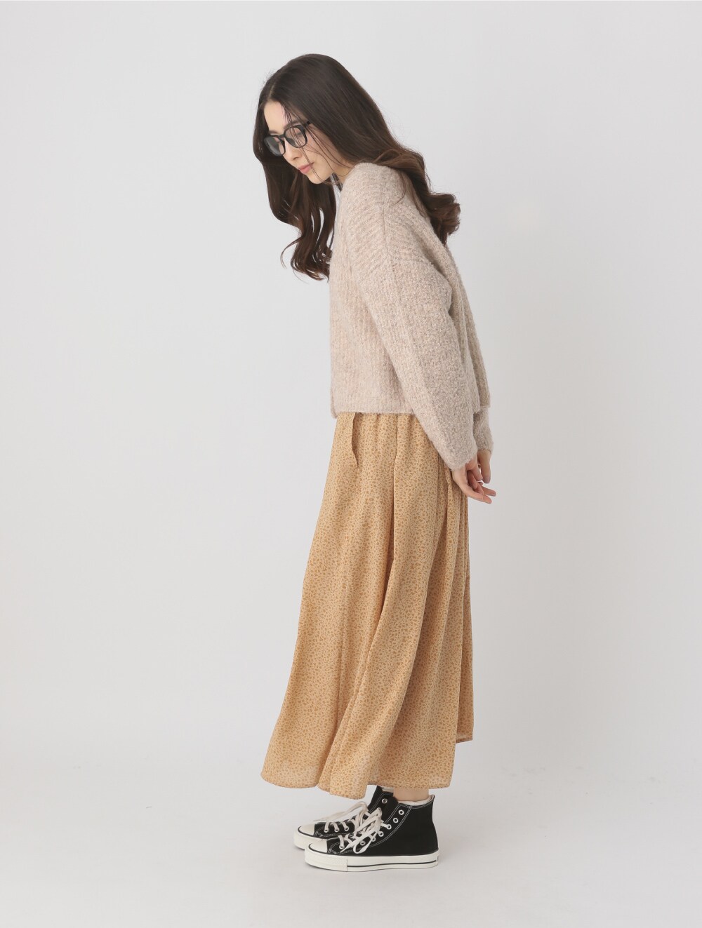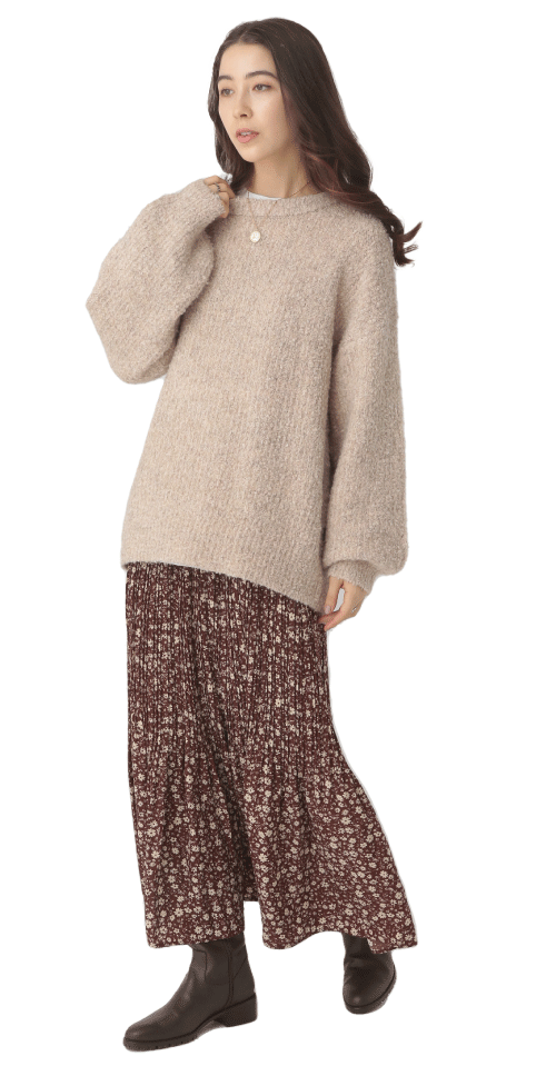 花柄スカート合わせや袖ボリュームのニットで甘すぎないスタイリングを楽しんでみて。
