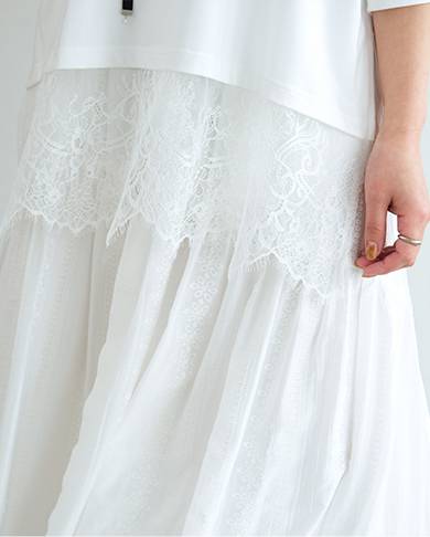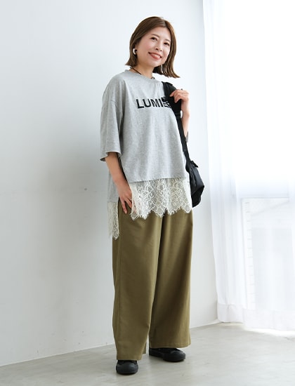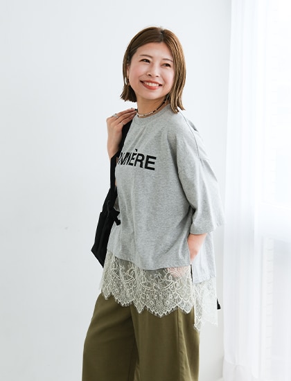 トレンドのレース切り替えTシャツ。