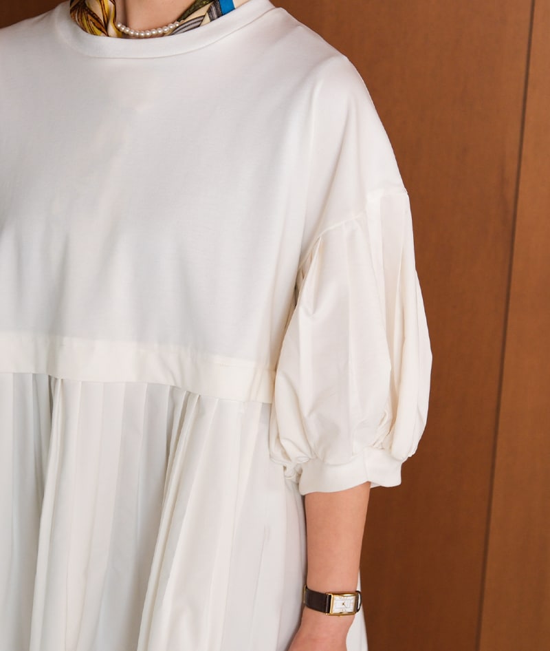 プリーツがドッキングされたデザイントップス。