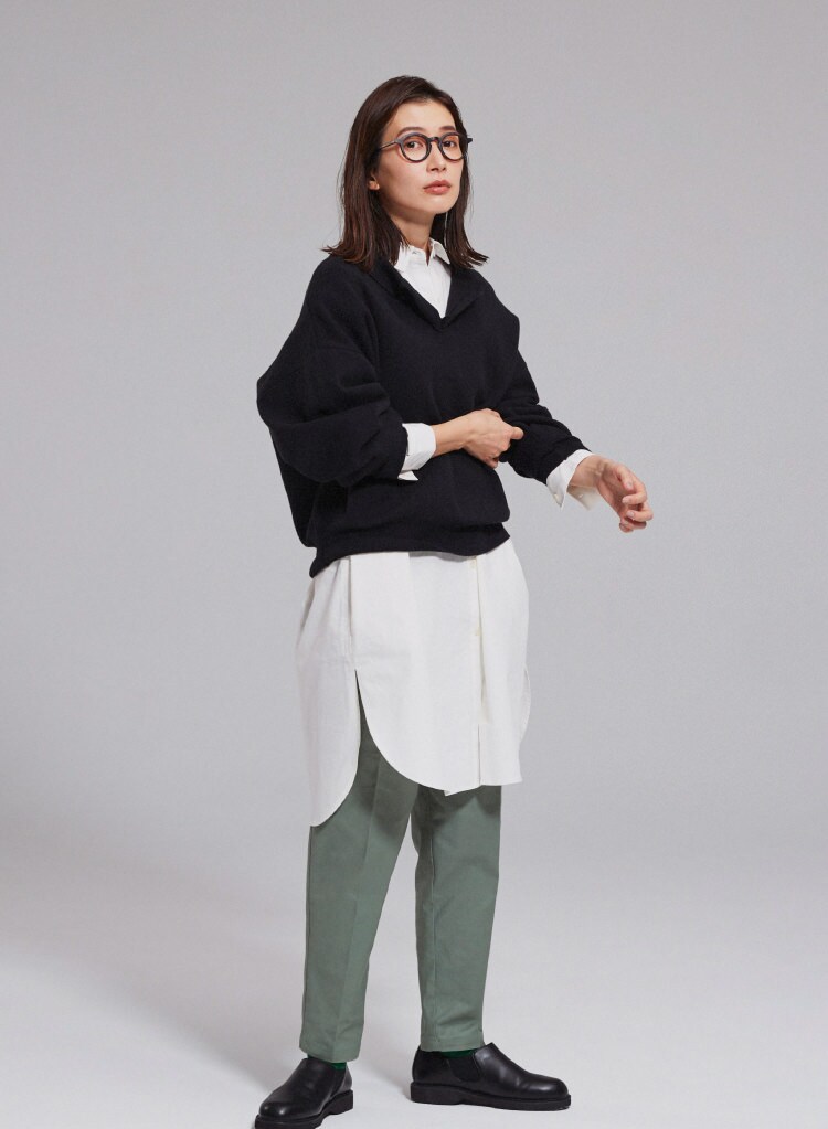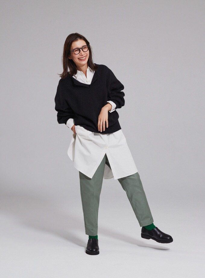 レイヤードスタイルは、ニットからシャツの襟や、袖見せることで抜け感のある着こなしに。チュニック丈のシャツで気になるお尻まわりをカバー◎
