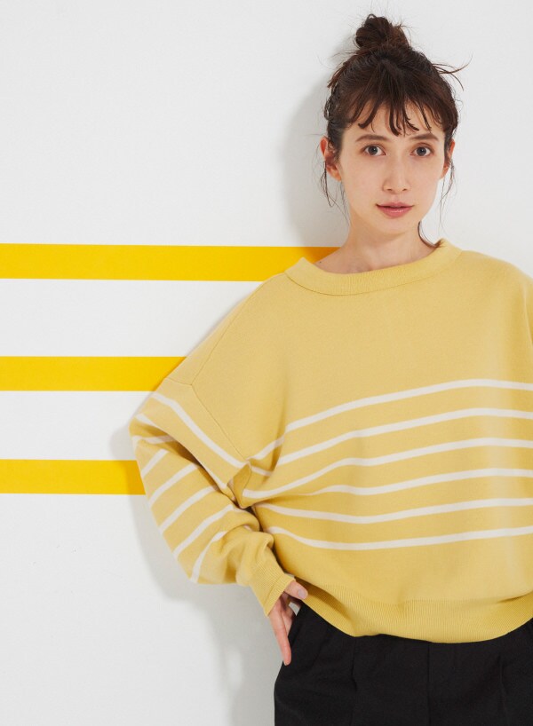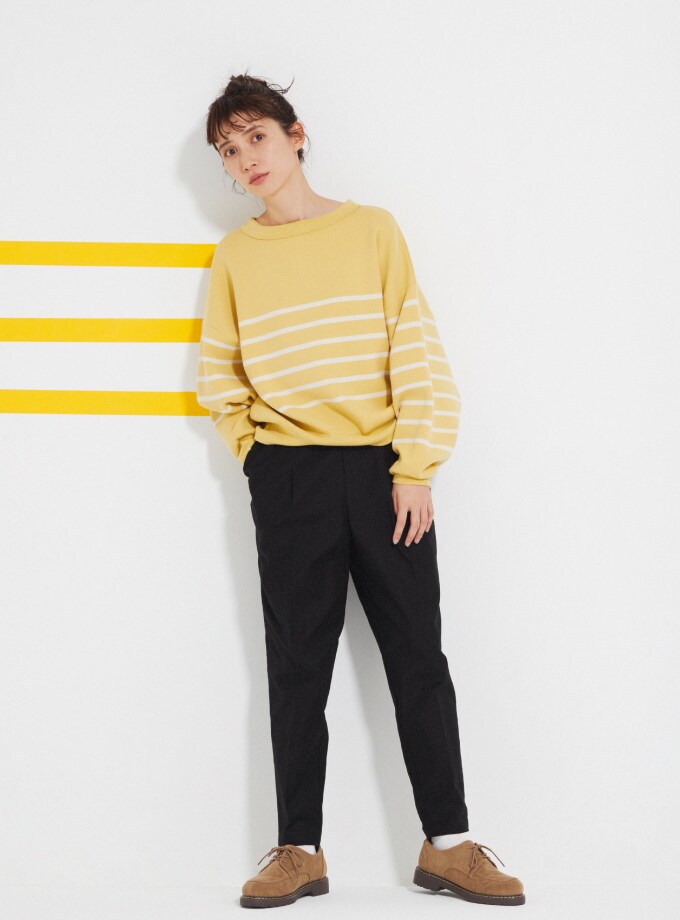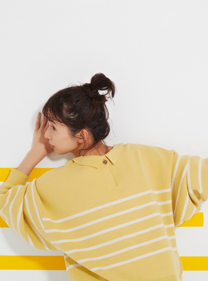 春らしいイエローボーダーには、引き締めのブラックボトムを合わせることで大人カジュアルに。ヘアもアップスタイルで軽さプラス。