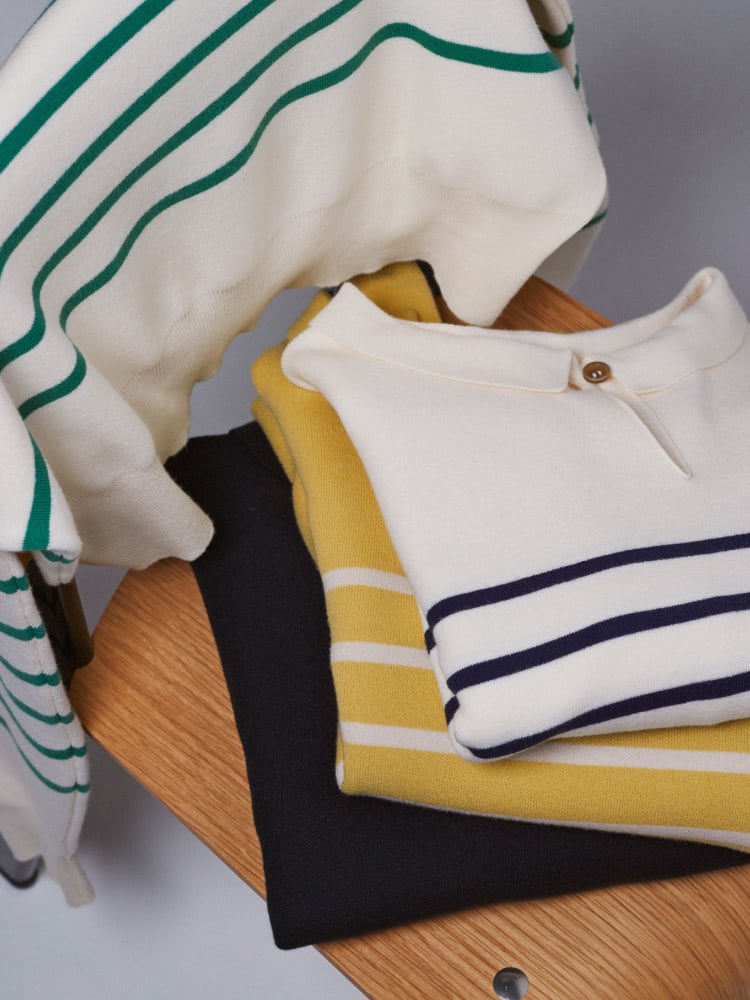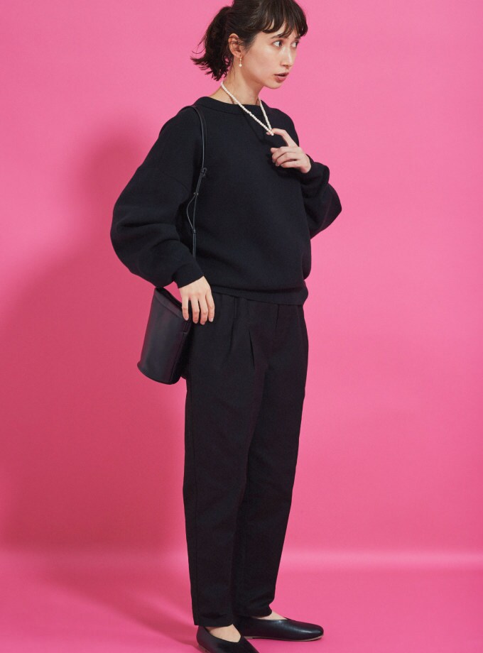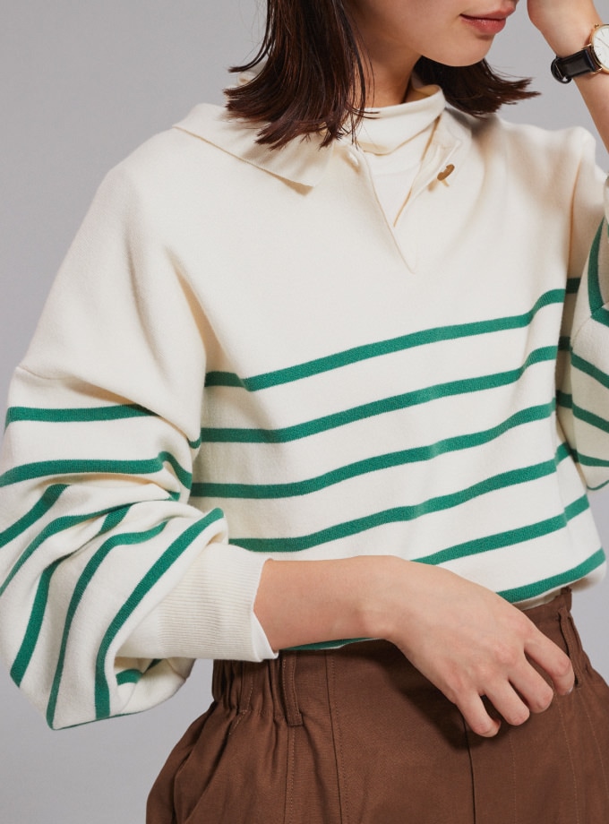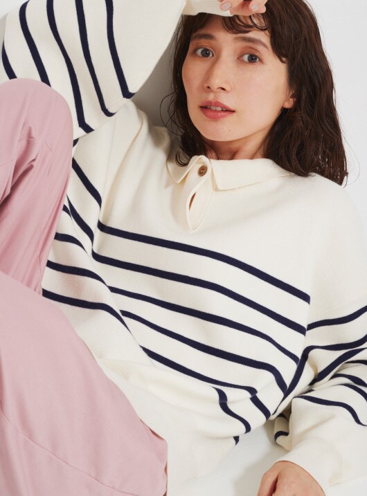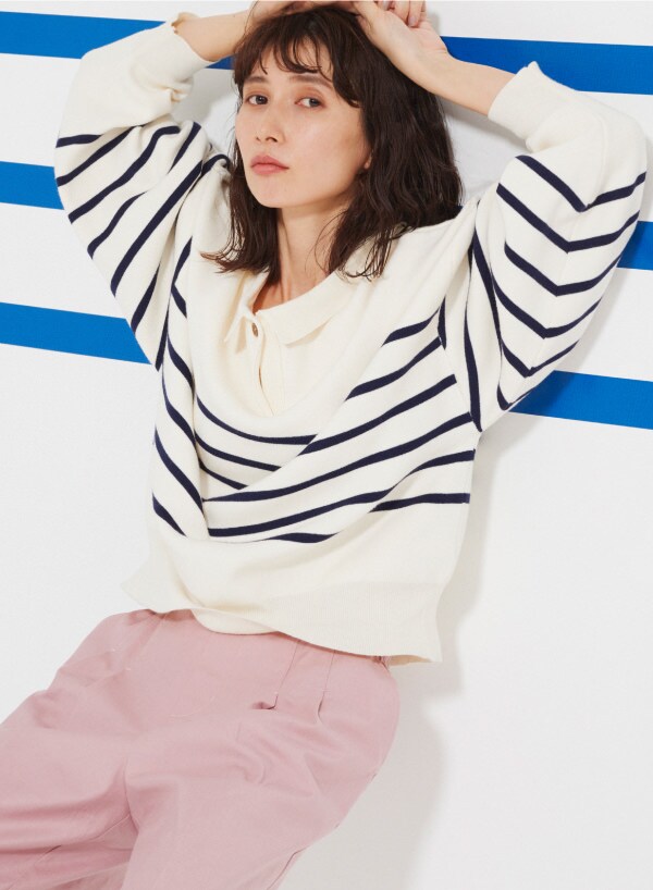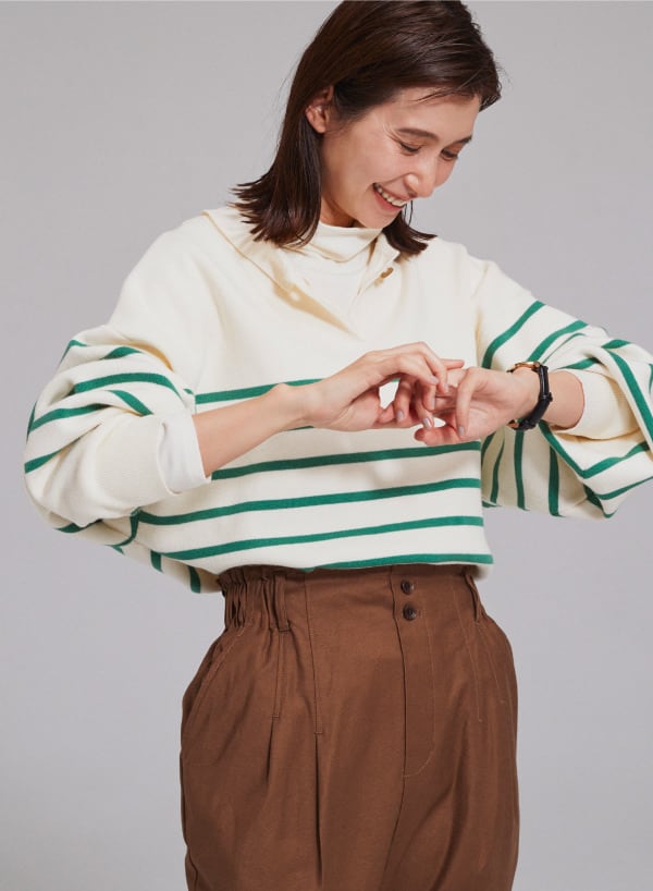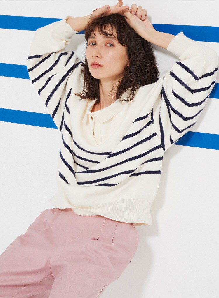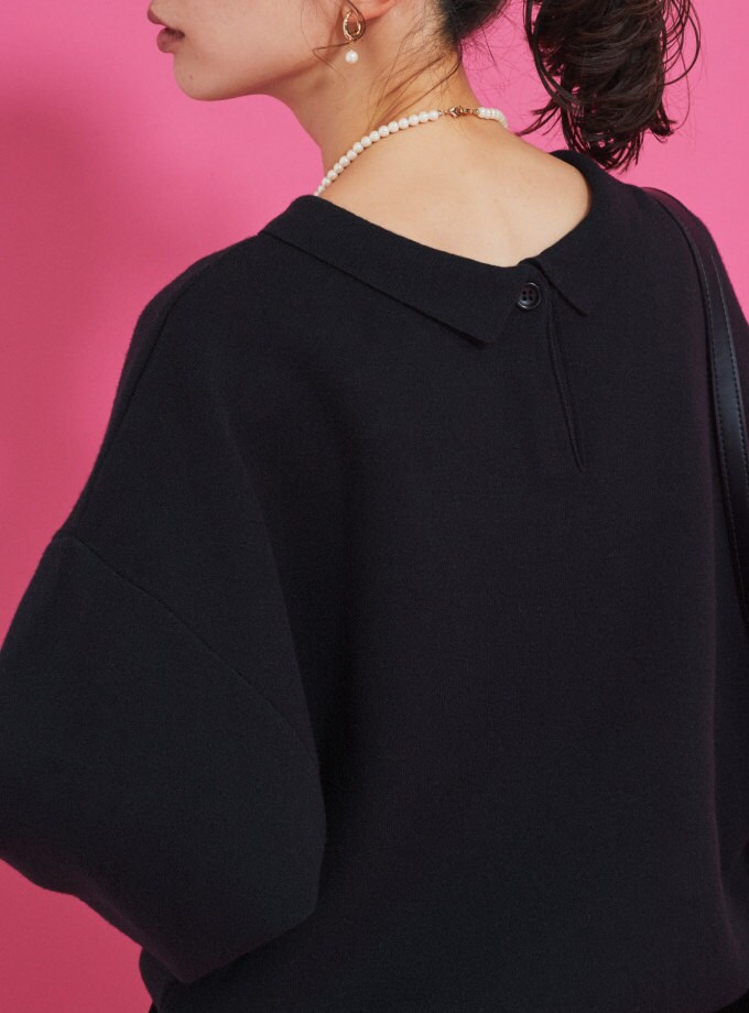 今年らしい衿付ニットは、ボタンを前でシャツのように、ボタンを後ろのワンポイントに、前後2WAYで楽しめる。1枚でサマになるボリューム袖に、ゆったりとしたシルエットだから、シャツやハイネックとのレイヤードもおすすめ。