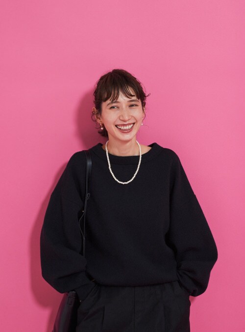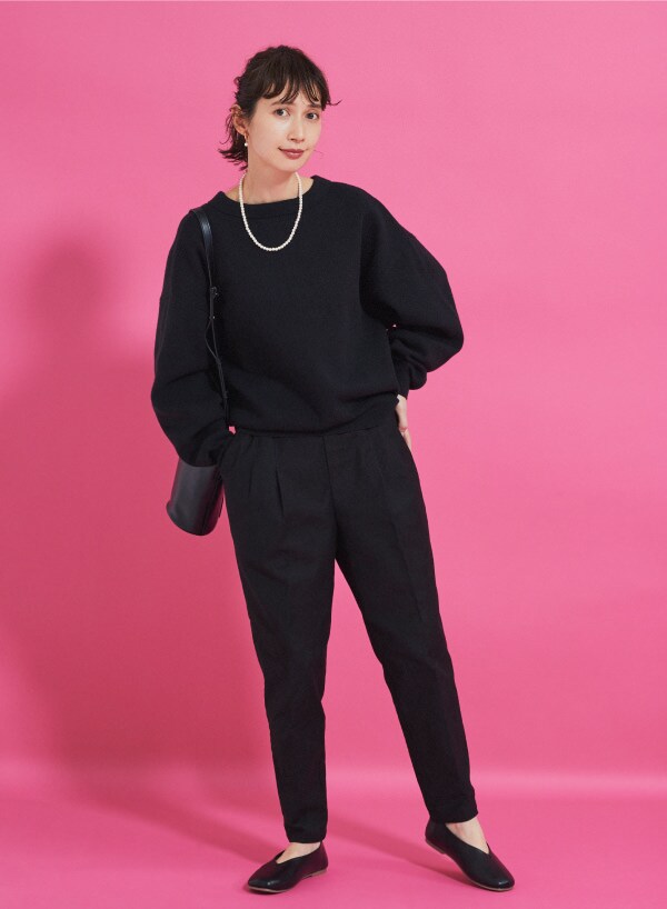 ブラック×ブラックは、参観日などの学校行事に使えるオケージョンスタイル。バックやシューズを黒でまとめ、パールのアクセサリーで華やかさを。