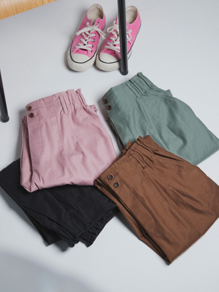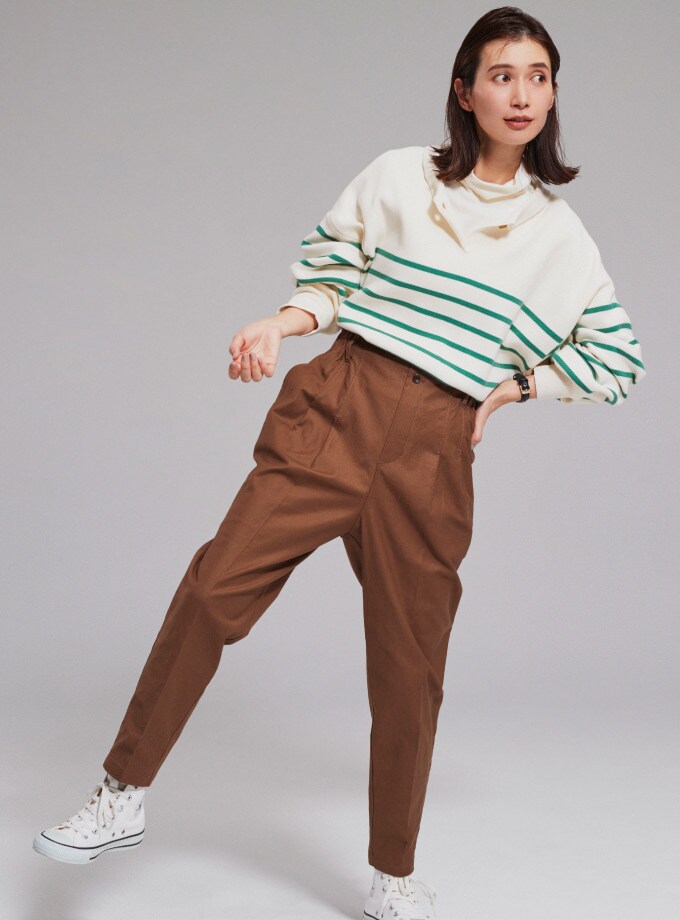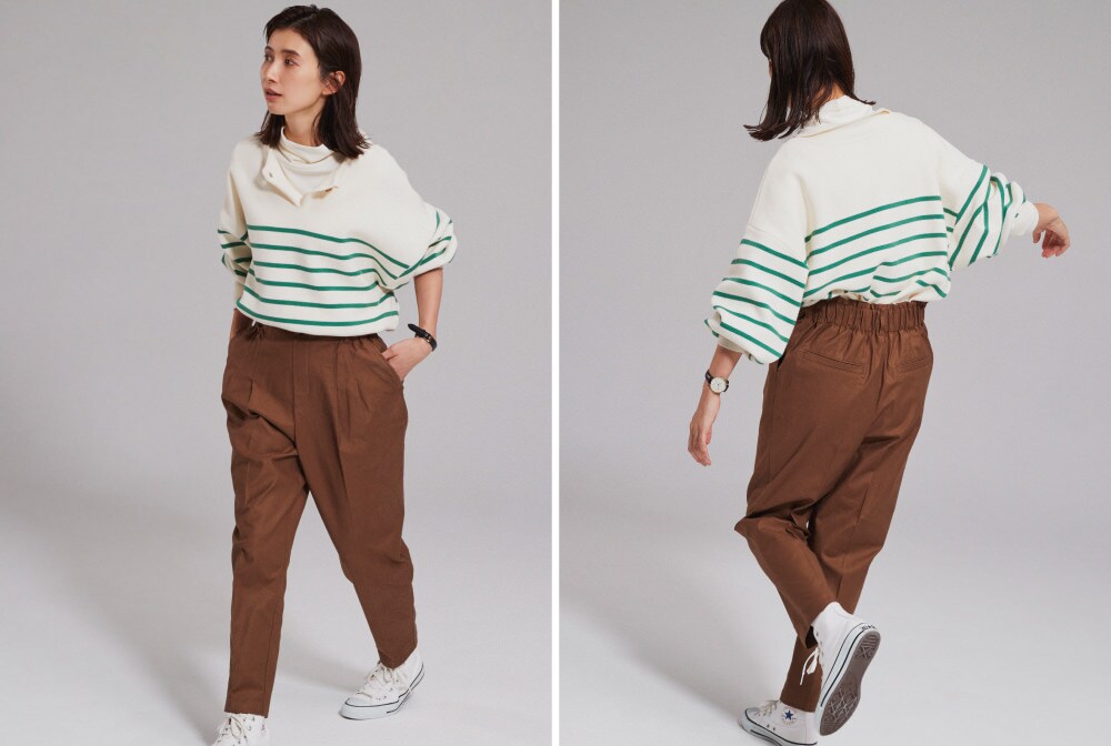 高めのウエストがしっかりとお腹まわりをホールドしてくれる安心パンツ。ストレッチ性のある素材で動きやすく、後ろはお腹を締め付けない太めのウエストゴムで楽ちんに。強めのテーパードとセンタープレス仕様で美脚効果も。
