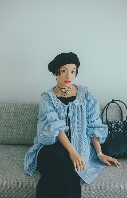 「コットンレースの襟を、すっきりタイトにしたり、クシュっとさせて可憐な印象にしたり、2wayで楽しめるブラウス。ボリュームのあるバルーンスリーブの華やかなバランスも楽しんで!」