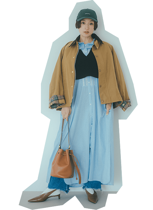 「甘いワンピースに辛口のアイテムを合わせたカジュアルスタイル。ショートベストでポイントを上に作ると、視線が上に来るので、小柄な方でもバランスよく見えておすすめです!」