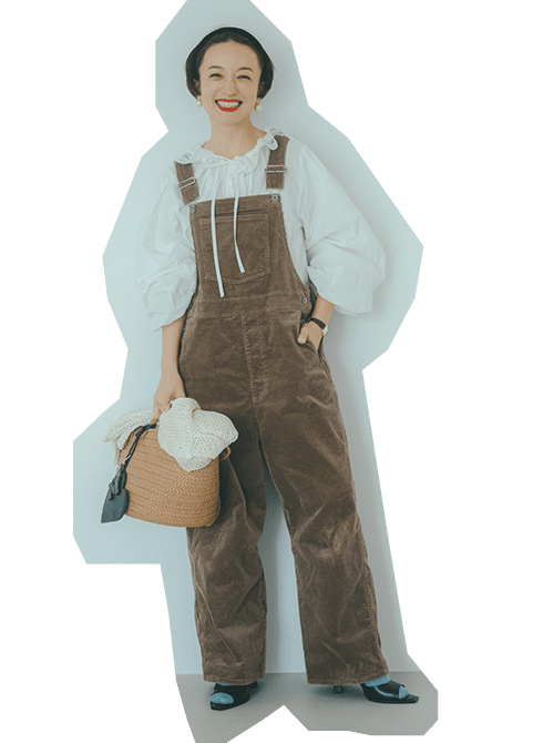 「オーバーオールを合わせるのは私の定番。水色のソックスで春を意識した差し色を入れ、カチューシャやシューズ、バッグに付けたチャームの黒でぴりっと全体を引き締めています」