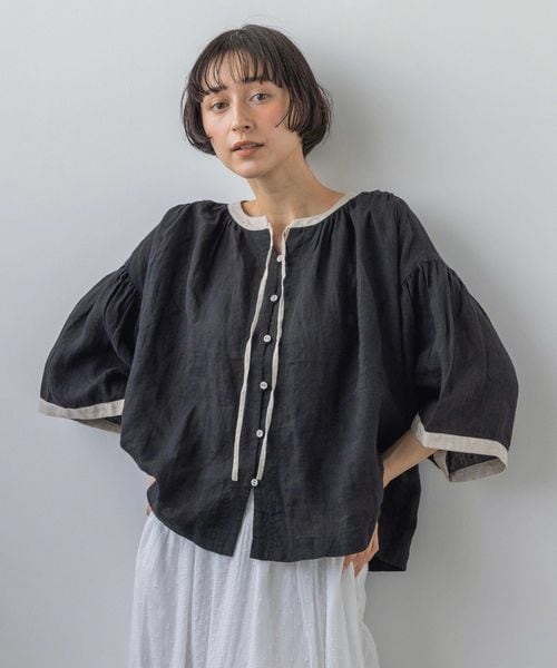 《先行予約/natural by clip》リネン配色フレアスリーブブラウス