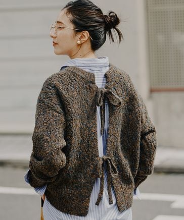 5ゲージダブルフロントブークレリボンニットカーディガン
