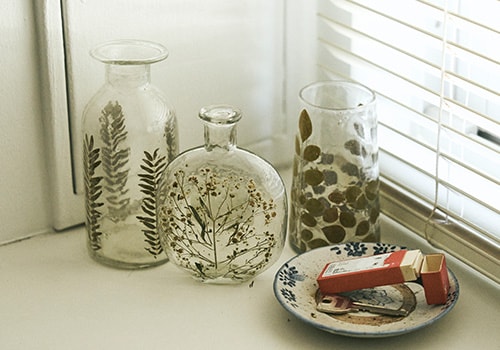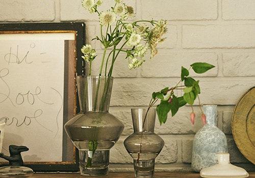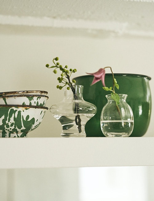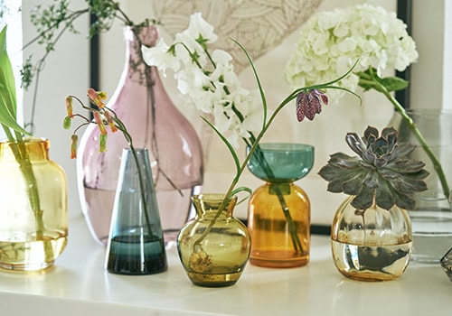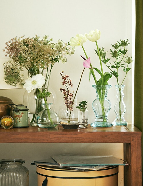 鮮やかなガラスの器に、あえて飾る白と緑の花々。