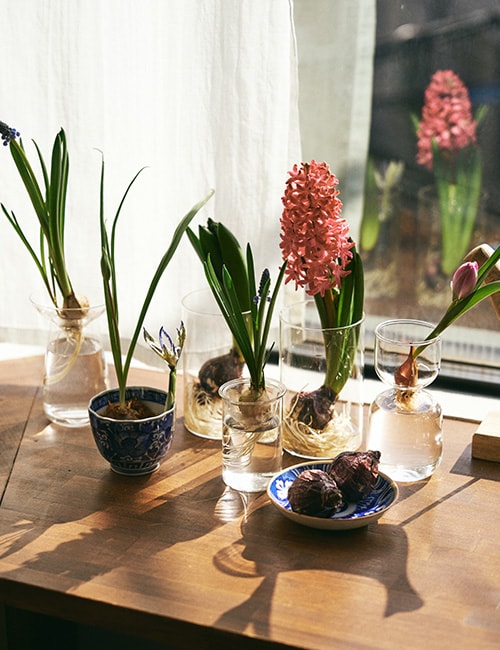 暦の上では春とわかってはいても体感温度はまだまだ寒く、それでも季節の移り変わりをふと感じる瞬間もあって。 そんな時季は、花屋さんへ行ってみましょう。チューリップ、ヒヤシンス、水仙やムスカリなどの球根。 切り花なら、ラナンキュラスやアネモネ。あの黄色を見るだけで元気がもらえるミモザ。 色とりどりの花から、季節のめぐりを実感できるはず。