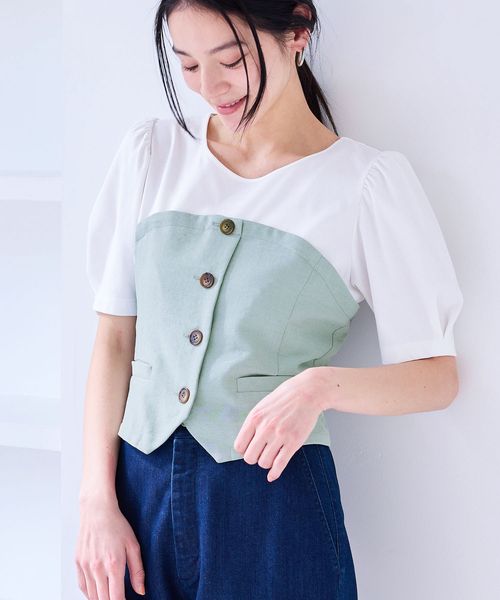 【新色追加】【美easy】釦ビスチェTシャツドッキングプルオーバー【接触冷感/洗える】