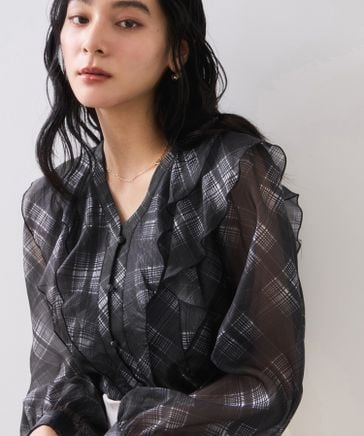 フロントフリルシアーチェックブラウス/イージーケア